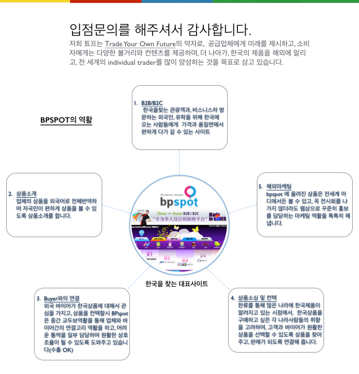 *저희 BPspot는 한국제품을 해외에 알리고 홍보하며, B2B와 B2C를 지향합니다.